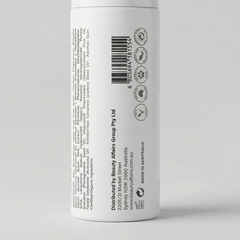 Ingredients: Aloe Barbadensis (Aloe Vera) Leaf Juice*, Glycerin, Propanediol, Butylene Glycol, Carbomer, Polysorbate 20, Palmitoyl Tripeptide-1, Palmitoyl Tetrapeptide-7, Dipropylene Glycol, Quercus Suber Bark Extract, Panthenol, Phenoxyethanol, Ethylhexylglycerin, Silica, Ubiquinone, Sodium Hyaluronate (Vegan), Ascorbyl Tetraisopalmitate, Punica Granatum (Pomegranate) Seed Oil, Hippophae Rhamnoides (Seabuckthorn) Fruit Oil, Persea Gratissima (Avocado) Oil*, Simmondsia Chinensis (Jojoba) Seed Oil*, Xanthan Gum.