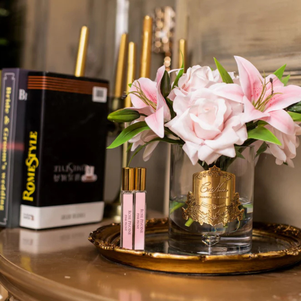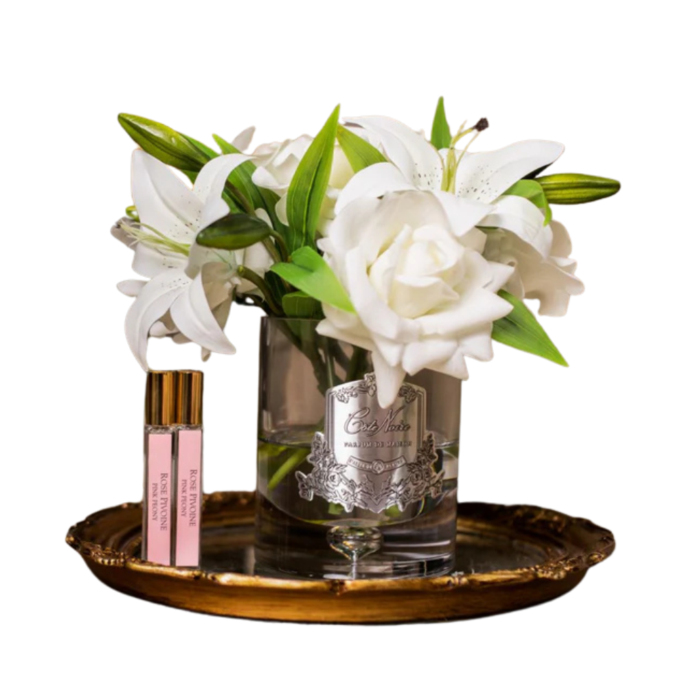 Each life-like perfumed Luxury Lilies & Roses Bouquet has been skilfully hand crafted and is set in gel giving it the appearance of water. Each petal has a special natural coating to give them a true to life touch & appearance. Arranged in a hand-blown glass vase with gold Cote Noire signature badge.