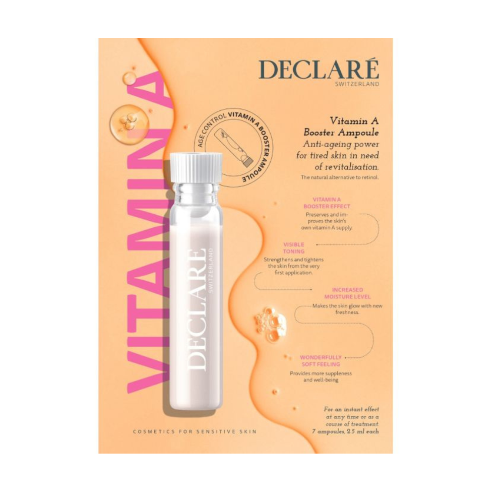 The Declare Age Control Vitamin A Booster Ampoule is a concentrated emulsion designed for anti-aging treatment. It features a plant-based alternative to retinol derived from the mastic shrub, which helps to smooth the skin, reduce wrinkles, and improve skin elasticity.